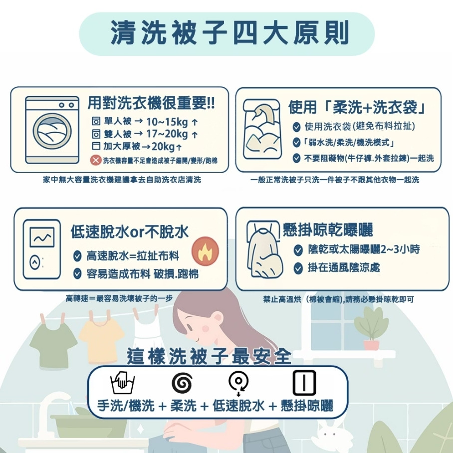 2.建議放入洗衣機單獨清洗,不要跟其他衣物或是棉被一起清洗,避免染色或拉鍊等硬物勾壞棉被。