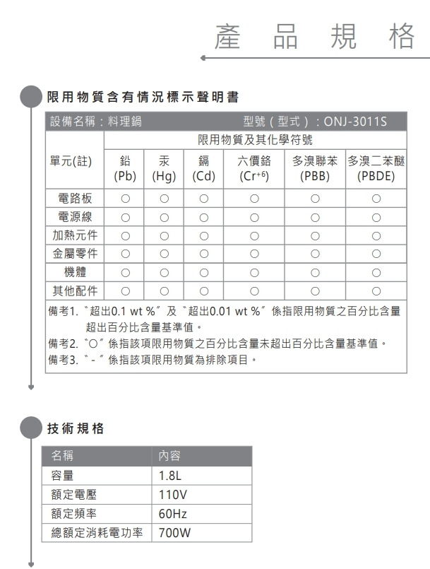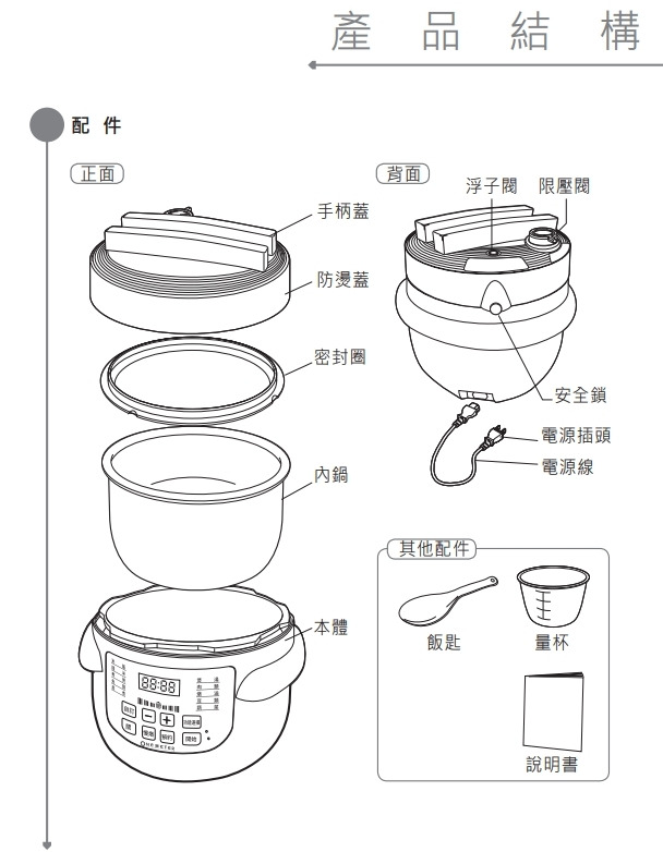 ◎配件:主機x1、內鍋x1、飯勺x1、量杯x1、電源線x1、說明書x1